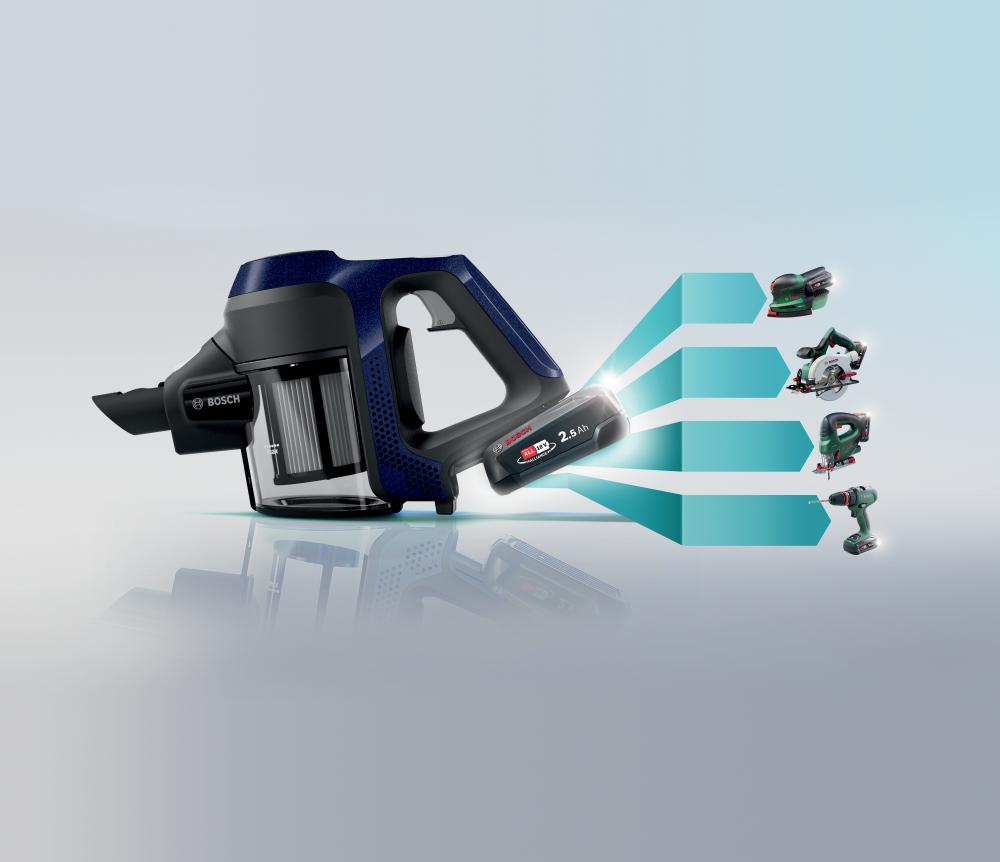 Naš najbolj kompakten ročaj brezžičnega sesalnika v elegantni modri barvi. Zamenljiv baterijski komplet je del sistema Power for ALL in je zato kompatibilen z različnimi aparati Bosch iz zelene produktne linije.