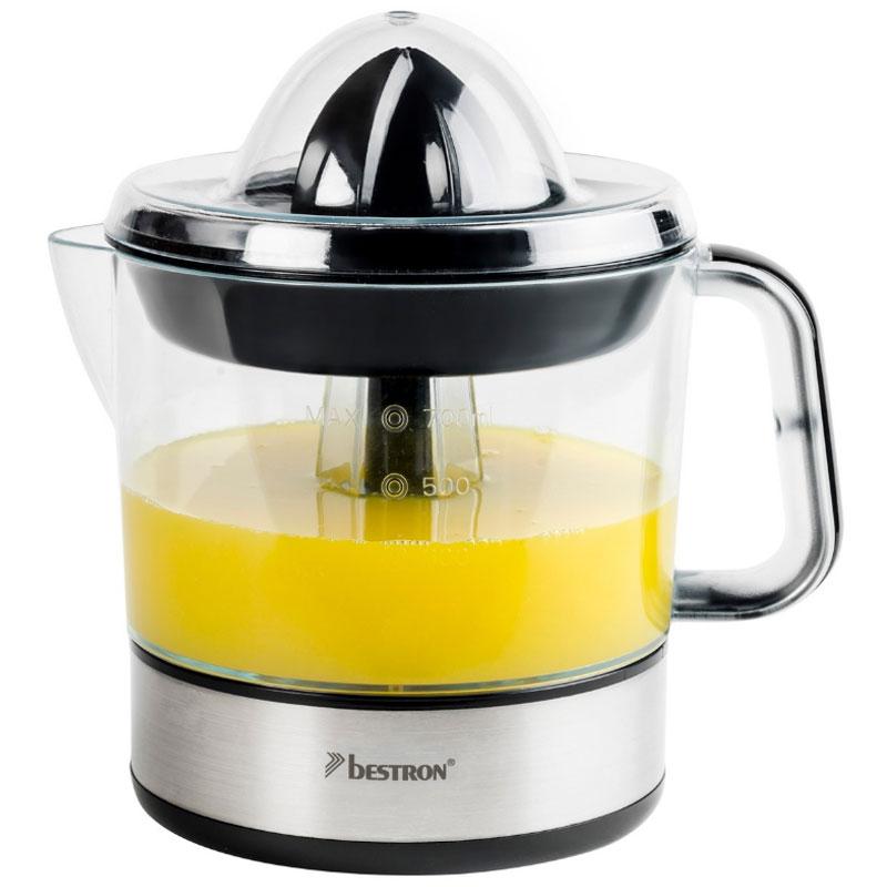 BESTRON ACJ350Z 0,7L ožemalnik citrusov ponuja veliko odstranljivo posodo za sok s približno 700 ml. Ožemalnik ima dve različni velikosti stiskalnic za vse vrste agrumov. Prozoren pokrov se lahko uporablja tudi kot pripomoček za stiskanje. Zelo enostavno čiščenje, vsi predmeti, razen ohišja motorja, so primerni za pomivanje v pomivalnem stroju. Z nedrsečimi nogicami bo ožemalnik ostal na mestu.