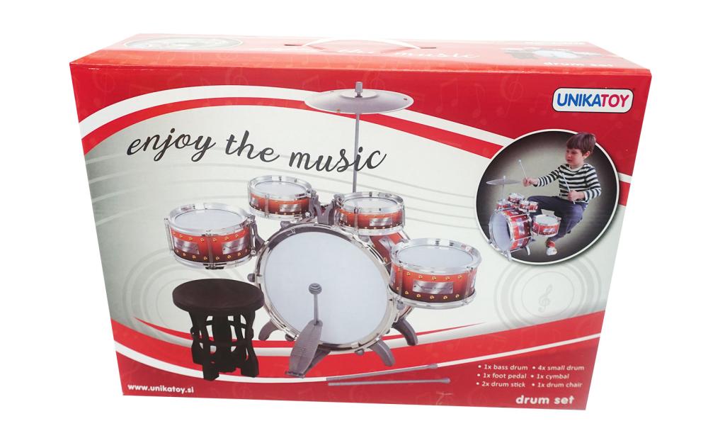 POSTANITE PRAVI GLASBENIK IN ZAIGRAJTE RITMIČNE MELODIJE! Naj vaš otrok odkrije čarobni svet glasbe s tem čudovitim kompletom bobnov! Set je popolna izbira za male glasbene navdušence, ki želijo razvijati svoj ritem in ustvarjalnost. POPOLN KOMPLET ZA IGRANJE. Set bobnov vsebuje vse, kar potrebuje vaš mali bobnar: velik bas boben, dva srednja in dva mala bobna, činele, nožni pedal, dve bobnarski palici ter stolček za udobno igranje. ERGONOMSKA OBLIKA IN PRILAGOJENE DIMENZIJE: velik bas boben: premer cca 29 cm, višina 16 cm, srednji bobni: premer cca 15,5 cm, višina 9 cm, mali bobni: premer cca 11,5 cm, višina 5,6 cm, činele: premer 19 cm, stolček: višina 19 cm, premer sedeža 18 cm (ni primeren za otroke težje od 48 kg), celoten sestavljen komplet: dolžina 60 cm, globina 40 cm, višina 50 cm. RAZVIJA MOTORIČNE SPOSOBNOSTI IN RITEM. Igranje bobnov pomaga otrokom razvijati občutek za ritem, izboljšuje koordinacijo ter spodbuja glasbeno izražanje. To je odličen način, da otroci skozi igro pridobijo prve glasbene izkušnje! Naj se zabava in glasbeno ustvarjanje začneta!
