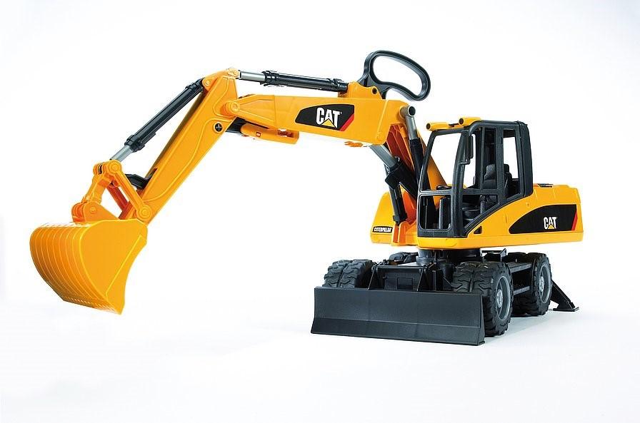 Bruder Bager CAT 02445 – Tipičen BRUDERjev način posnemanja realnosti z mobilnim bagerjem je, da 2 podporni nogi stabilizirata bager in zagotavljata varno delo. Vsebuje gumijasta kolsa, roko in zajemalno žlico, ki se uporabljata in premikata povsem enostavno. Zajemalka se upravlja z ročico. Kabina bagra CAT se vrti za 360 stopinj, pokrov motorja se odpira in razkriva pogled na ventilator.