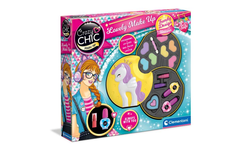 Samorogi so prelepa in misteriozna bitja, ki v svet prinašajo obilo veselja. Enako lahko pričakujete od make up seta Crazy Chic z motivom samoroga. Izberite ličilo in naj se zabava začne. V setu so vključeni šminka, lak za nohte, lip gloss, senčilo za veke ter aplikator za nanašanje.Make-up paleta je priročne oblike, zato jo deklice lahko vsepovsod vzamejo s seboj.SESTAVINE/INGREDIENTS:(1-7) POWDERED EYE SHIMMER – ESKETAJOČE SENČILO V PRAHU ZA VEKE 4,2 g: Talc, Mica, Magnesium Stearate, ethylhexyl Palmitate, Polybutene, Panthenol, Phenoxyethanol, Octane-1,2-diol,Etylhexylglycerin, Parfum – Strawberry. +/-: CI 45410, CI 19140, CI 42090.(8-10) LIPSTICK – ŠMINKA 1,5 g: Ricinus Communis Seed Oil, Ethylhexyl Palmitate, Candelilla Cera, Polybutene, Cera Alba, Tridecyl Trimellitate, Isopropyl Palmitate, Copernicia cerifera Cera, Phenoxyethanol, Parfum – Strawberry. +/-: CI 45410, CI 19140, CI 42090.(11-13) NAIL POLISH – LAK ZA NOHTE 15 ml: Aqua, Polyvinyl Alcohol, Mica, Carbomer, Sorbitan, Sesquioleate, Citric Acid, Phenoxyethanol, Octane-1,2-diol, Etylhexylglycerin. +/-: CI 45430, CI 42090, CI 19140.(14) SHINY LIP GLOSS – LESKETAJOČE LIČILO ZA USTNICE 15 g: Polybutene, Ethylhexyl Palmitate, Tridecyl Trimellitate, Candelilla Cera, Cera Microcristallina, Cera Alba, Isopropyl Palmitate, Mica, Parfum-Strawberry, Phenoxyethanol. +/-: CI 45410, CI 42090.