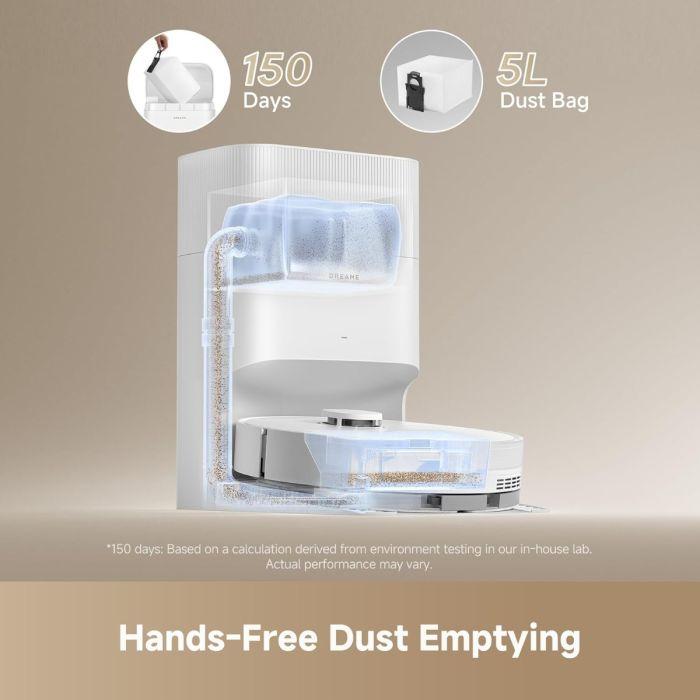 150 dni brezskrbnega čiščenja — brez praznjenja posode za prah! Do 150 dni brez nereda! D20 Plus se samodejno prazni v 5L vrečko za prah, zato se vam ni treba dotikati umazanije. Popoln za zaposlene družine, domove s hišnimi ljubljenčki ali vse, ki sovražijo praznjenje posod vsakih nekaj dni.
