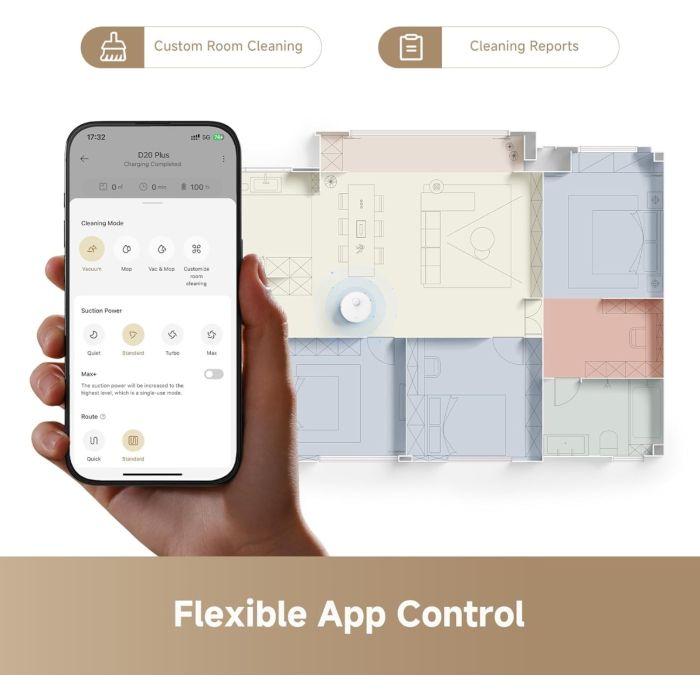 Pametno mapiranje s Pathfinder — noben kotiček ni izpuščen D20 Plus uporablja napredno tehnologijo Pathfinder za natančne in urejene zemljevide vašega doma, ki jih lahko urejate. Prepovedana območja? Več nadstropij? Ni problema. Vsak kotiček bo vedno očiščen.