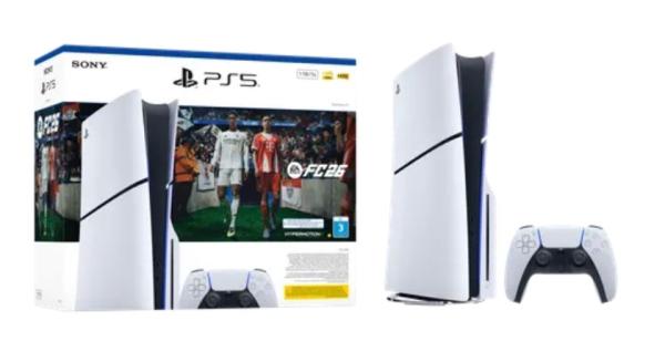- Komplet vključuje konzolo PS5 (Slim) z diskovnim pogonom in igro EA Sports FC26.