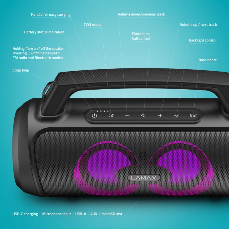 Funkcija Funkcija Power Bank prek vrat USB-A, nadzor pesmi (predvajaj/pavza, naslednja/prejšnja pesem), nadzor glasnosti, nadzor telefonskih klicev (sprejemanje/zavrnitev dohodnih klicev, končanje klica), podpora za glasovnega pomočnika (Siri, Google Assistant), TWS funkcija , tehnologija LAMAX BeatBass®, moderiranje + karaoke način z mikrofonom, FM radio