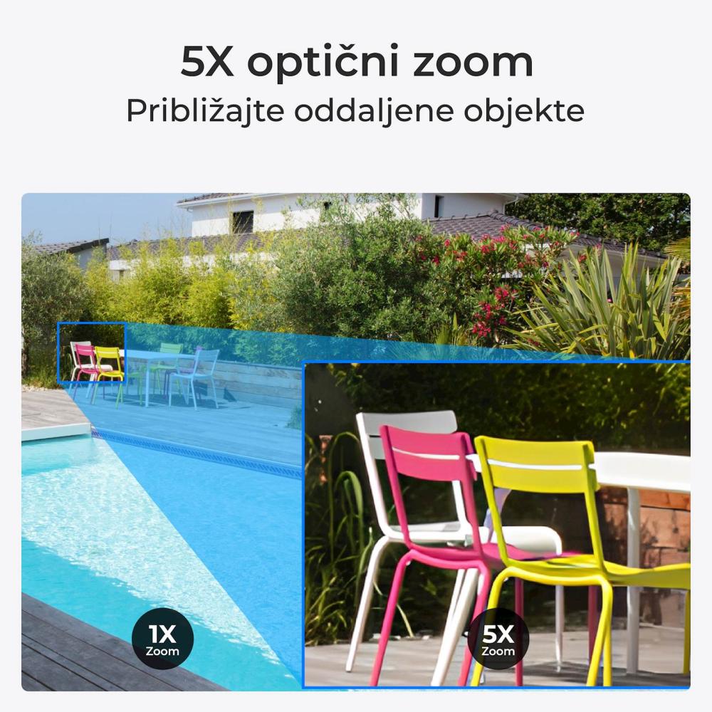 Izkusite neprimerljivo kakovost slike z jasnostjo 4K in zagotovite popolno pokritost z možnostjo premikanja za polnih 360 stopinj in nagibanja do 90 stopinj. Z lahkotnim približevanjem s 5-kratnim optičnim zoomom zajame drobne podrobnosti brez žrtvovanja kakovosti slike. S samodejnim sledenjem v kombinaciji s pametnim zaznavanjem ljudi, vozil in živali lahko samodejno sledi premikajočim se predmetom, ko se sproži zaznavanje. Z barvnim nočnim vidom razširi vašo vidljivost v noč. Pan-Tilt in samodejno sledenje Pomakne se za 355° in nagne za 90° za samodejno sledenje zaznani osebi ali ljubljenčku, tako da ne boste zamudili ničesar pomembnega. Prilagodljiva patruljna pot:Enostavno spremljajte najbolj ranljiva območja vašega doma, tako da jih dodate na patruljno pot, kar vam omogoča, da opazujete do 16 položajev s samo enim dotikom. Prilagodljive možnosti shranjevanja Uživajte v prilagodljivosti več možnosti shranjevanja s podporo za kartice microSD do 256 GB, sisteme NVR in strežnike FTP, ki ustrezajo vašim posebnim potrebam in željam.