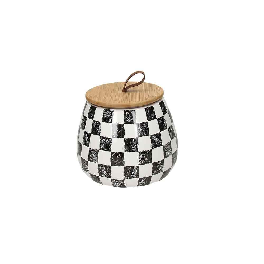 Posoda za shranjevanje živil linije DOLCE CASA DAMA blagovne znamke Andrea Fontebasso meri 12 cm v višino, njen premer je 14 cm, skupna prostornina doze pa je 900 ml. Črno-bel karirasti vzorec v kombinaciji z lesenim pokrovom ustvarja brezčasni element, primeren za vse vrste okolja in domov. Posoda je idealna za shranjevanje suhih živil, za katere želite, da ohranijo svežino in aromo.