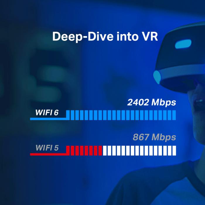 S pasovno širino 1024-QAM in 160 MHz je Wi-Fi 6 bolj zmogljiv kot navadni standardi Wi-Fi in potrebuje visoke hitrosti pri bolj zahtevnih aplikacijah, kot je npr. VR. (*1)   Wi-Fi 6 ponuja 3x hitrejše hitrosti kot Wi-Fi 5. (*2)