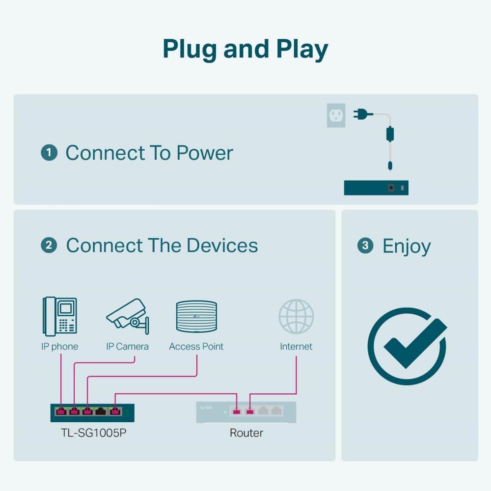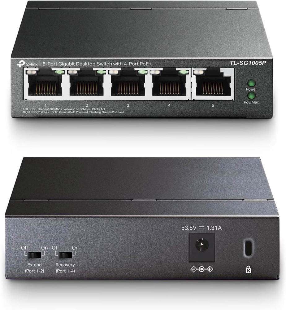 TP-LINK TL-SG1005P 5-Port Gigabit namizno stikalo-switch s 4-Port PoE zagotavlja enostavno in hitro omrežno povezavo in enostavno postavitev IP kamer in dostopnih točk, ki za napajanje uporabljajo PoE.